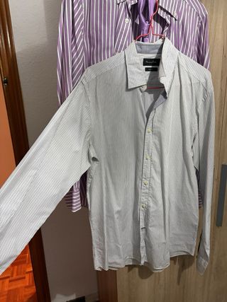 2 Camisas de manga larga con un diseño de rayas verticales. - Cuello con botones. - Tejido ligero. Regalo corbata morada La blanca tiene una pequeña mancha que se ve en las fotos