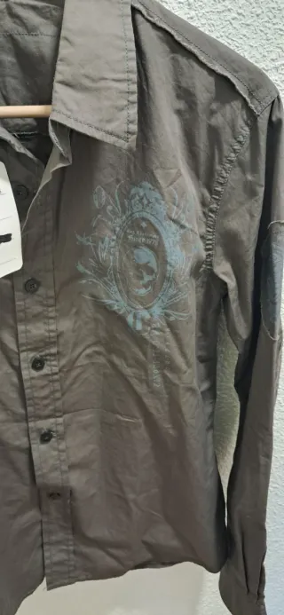 Camisa de manga larga para hombre con un diseño gráfico llamativo en la parte delantera. - Cuello camisero. - Cierre de botones. - Estampado de escudo con calavera y detalles ornamentales.