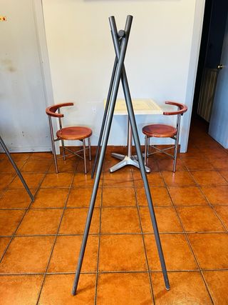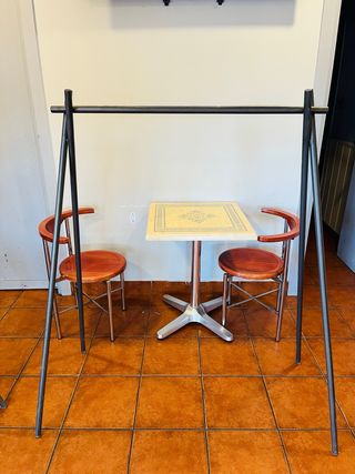 Perchero de ropa con un diseño moderno, ideal para tiendas o para organizar tu espacio. - Estructura metálica. - Base de madera.