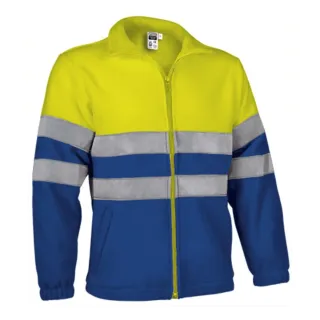 Chaqueta de trabajo con diseño bicolor y detalles reflectantes. - Parte superior amarilla. - Parte inferior azul. - Bandas reflectantes plateadas.