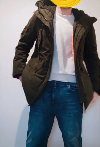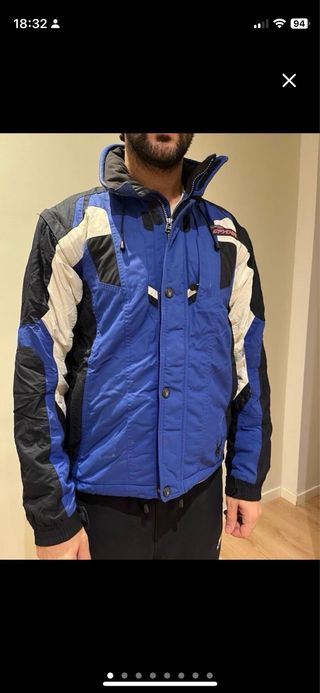 Chaquetón súper acolchado y muy abrigado. - Diseño con capucha. - Bolsillos frontales. - Cierre de cremallera y botones. Con capucha y visera. Manga doble. Apenas ha sido usado. Los botones se atan con un cierre elástico (falta uno de ellos pero se puede reponer fácilmente)