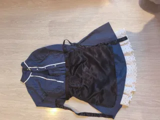Traje de casera en perfecto estado 4 piezas talla 8 - Vestido azul con estampado de lunares blancos.