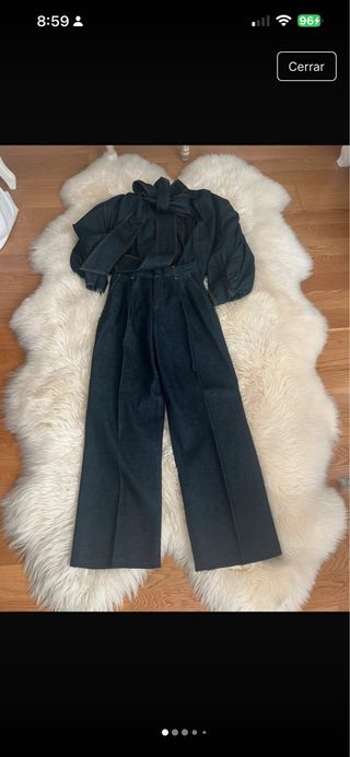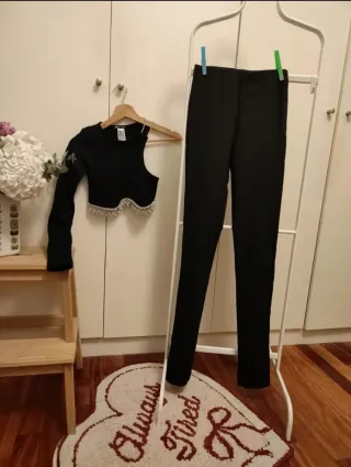 Conjunto de dos piezas. Talla XS - Crop top asimétrico con manga larga. - Adorno de pedrería en el escote. - Pantalón largo ajustado.