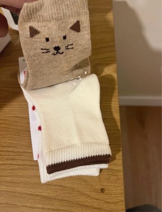 Pack de 3 calcetines para niño de Uniqlo. - Diseño de gatito en color beige. - De corazones en color rojo y fondo beige.