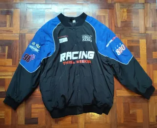 Cazadora bomber estilo racing de H&M Divided. - Diseño con paneles en azul y negro. - Inscripciones Racing, Thrill Seeker, Trackside 321, Motor Racing, Fina 800, 98 y Horspeed. - Cierre de botones a presión. - Talla XL.