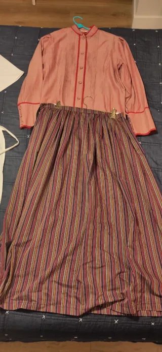 Conjunto tradicional de baserritarra - Blusa de color rosa con detalles rojos. - Falda larga a rayas multicolores. - Delantal y pañuelo blanco