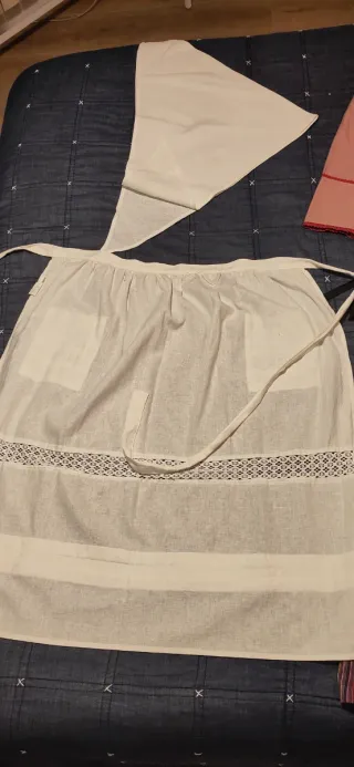 Conjunto de traje de casera, ideal para representaciones o disfraces. - Vestido estampado. - Delantal negro. - Pañuelo blanco al cuello.