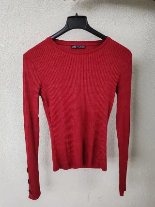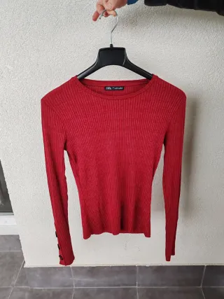 Bonita camiseta de manga larga en color rojo oscuro, detalle de botones en los puños. Talla S y en perfecto estado, sin uso.