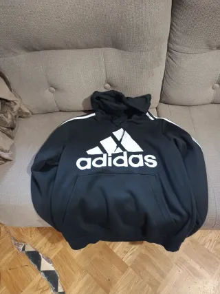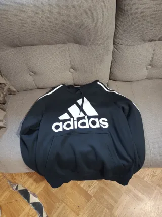 Sudadera con capucha Adidas en color negro. Solo ha sido usada una vez, se encuentra en perfecto estado. - Diseño con el logo de Adidas. - Mangas con las tres franjas características de la marca. - Bolsillo frontal tipo canguro.