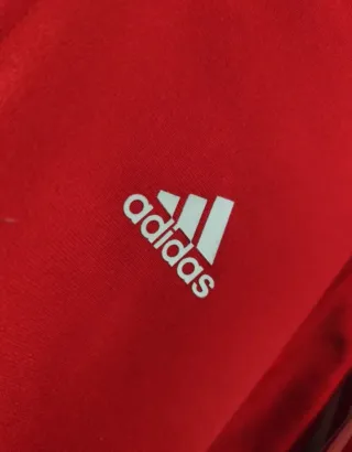 Chaqueta deportiva Adidas con un diseño clásico y llamativo. - Mangas y paneles laterales en color negro. - Cuerpo principal en color rojo. - Detalle de las tres franjas blancas en las mangas. - Logo de Adidas en el pecho. -Talla 174cm/M