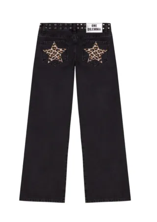 Pantalón vaquero de corte ancho con detalles únicos. - Estampado de leopardo en forma de estrella en los bolsillos traseros. - Cintura adornada con tachuelas. - Etiqueta de la marca ONE DILEMMA en la parte trasera.