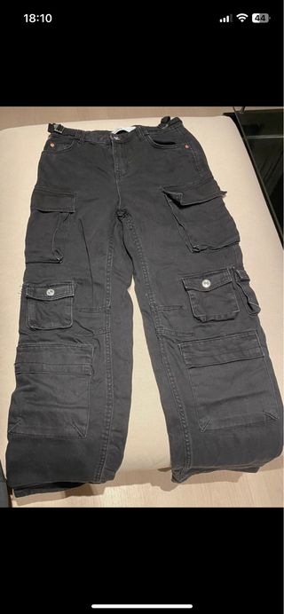 Pantalón negro de Bershka, multicargo, tela vaquera. Con muchos bolsillos (los de atras son falsos) y cintas en la cintura para ajustarlo. Anchos. Estan nuevos.