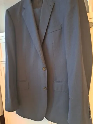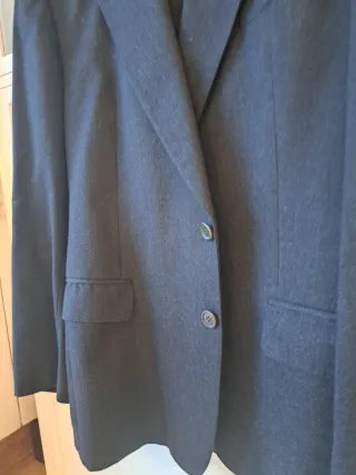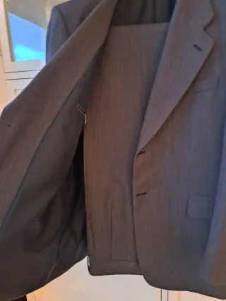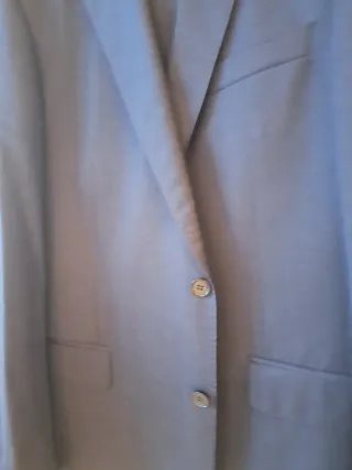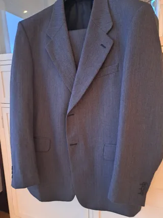 Traje de vestir de caballero con un sutil diseño de espiga. Medidas chaqueta hombros 50, axilas 60 y largo 80 cm y pantalon 48 de cintura y largo 105 - Chaqueta con solapa de muesca. - Cierre de dos botones en la chaqueta. - Bolsillos de solapa en la chaqueta. - Puños de chaqueta con botones.