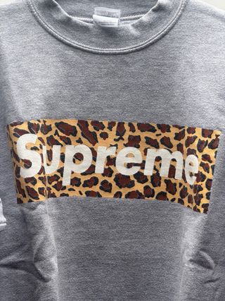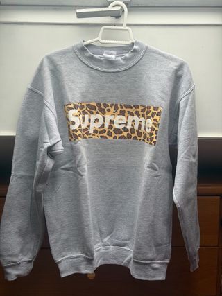 Sudadera gris con estampado de leopardo en la zona del pecho.