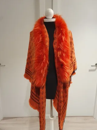 Elegante capa en color naranja, perfecta para añadir un toque de estilo. - Detalle de piel en el cuello. - Diseño con estampado loewe - Acabado con flecos cortos - Usado en dos ocasiones - En perfecto estado - Una prenda difícil de encontrar - Doble tela , más oscura por la parte interior . Se puede poner por los dos lados , uno con pelo y por el otro en oscuro sin pelo - 56%lana 34% viscosa