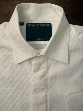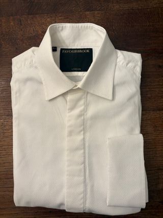 Camisa ajustada. En popelina de algodón. Con pechera, cuello estructurado y puños dobles. Perfecta para smoking o chaqué. El precio actual en web es de 269,95€. Ver mas fotos y medidas en la web Favoorbrook, modelo Marcella white.