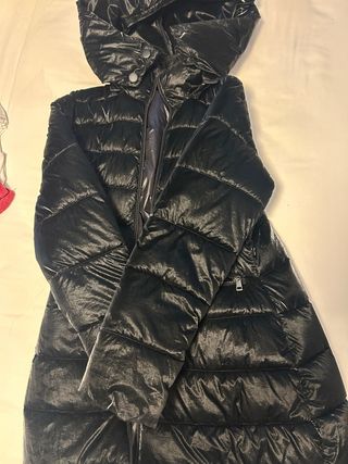 Abrigo largo de estilo acolchado con acabado brillante. - Diseño moderno y elegante. - Capucha integrada. - Cierre de cremallera.