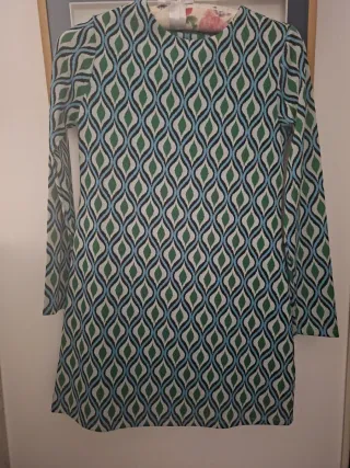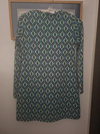 Vestido corto con un llamativo estampado geométrico. - Diseño de manga larga. - Cuello redondo. - Largo hasta la rodilla. No lleva cremalleras, es algo elástico Largo 80 cms, hombros 36, manga 58