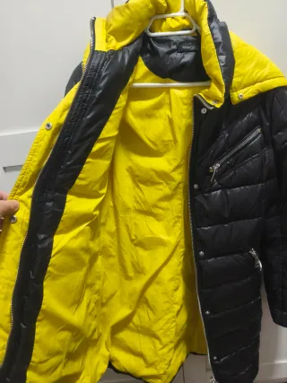 Abrigo de pluma natural,largo con capucha. - Cierre de cremallera. - Bolsillos frontales con cremallera. - Forro interior de color amarillo vivo.tiene un pequeño rasgado en el forro interior