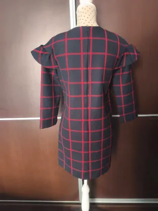 Vestido de Zara con un diseño de cuadros en azul y rojo. Presenta mangas medias y un detalle de volantes en los hombros. -da talla el maniquí es una S - Diseño de cuadros. - Mangas medias - Volantes en los hombros.