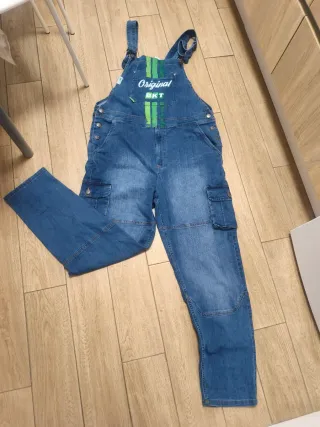 Peto vaquero largo de la marca BKT. Diseño original con detalles distintivos. -es elástico,da talla - Bolsillos cargo en los laterales. - Tirantes ajustables. - Costuras reforzadas en rodillas.