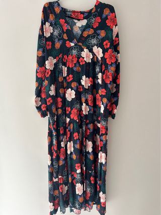 Vestido largo con un bonito estampado floral. Talla unica , equivale sobre 42 - Manga larga. - Escote en V. - Estampado multicolor sobre fondo azul Marino