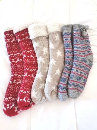 Conjunto de tres pares de calcetines de lana con un bonito diseño. - Diseño de jacquard con corazones y copos de nieve. - Pompones decorativos en la parte superior. - Tejido suave y cálido.