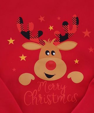 Sudadera con un divertido diseño de reno navideño y estrellas. - Estampado frontal con reno y Merry Christmas. - Detalle de cuadros en las astas del reno. - Fondo rojo con estrellas amarillas y rojas.