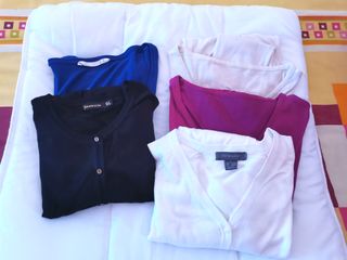 Conjunto de cinco jerséis finos de lana, perfectos para añadir a tu armario. - Jersey color burdeos. - Jersey color rosa con estrellas blancas - Jersey color amarillo mostaza. - Jersey color azul cielo. - Jersey de rayas marrones y blancas. Talla M 3eur/unidad