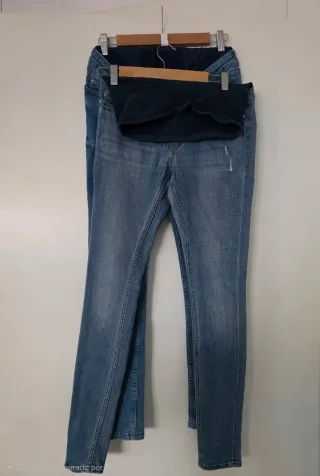 El pack está formado por 2 pantalones vaqueros de premamá de la talla 36/S, unos son de la marca H&M y otros de LaRedoute. La blusa y la camiseta son de Shein y ambas son la talla S