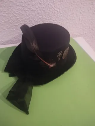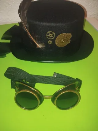 Conjunto de accesorio de disfraz con chistera y gafas estilo vintage. - Chistera negra decorada con engranajes y pluma. - Gafas con montura dorada y lentes verdes.