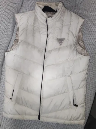 Chaqueta sin mangas de la marca Guess en color beige. Un básico versátil que combina con todo. - Diseño acolchado. - Cierre de cremallera. - Logo triangular metálico en el pecho.