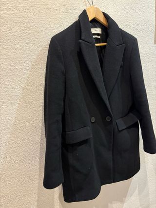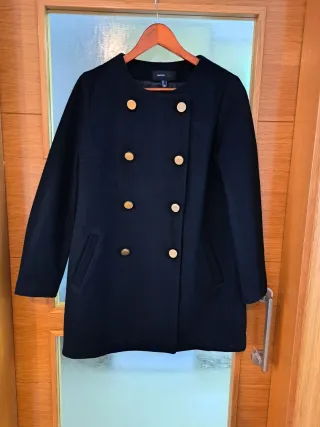 Elegante abrigo de Mango con un diseño clásico y detalles que marcan la diferencia. - Doble abotonadura frontal. - Botones metálicos dorados. - Cuello redondo. Sacado de tintorería, limpiado una vez