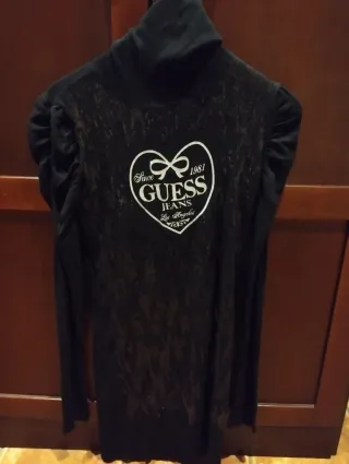 Vestido negro de Guess con cuello alto y manga larga. Presenta un diseño con estampado plateado y detalles en los hombros.Talla 16 a 18 años. Equivale a una 36. - Cuello alto - Manga larga - Estampado plateado - Detalles en hombros