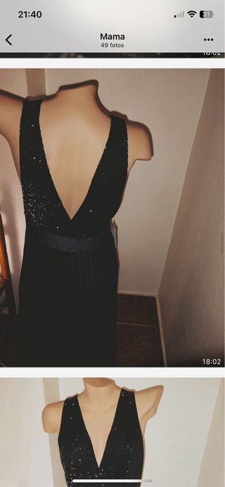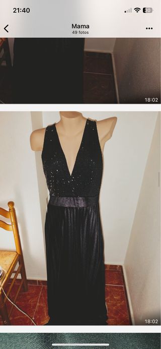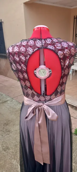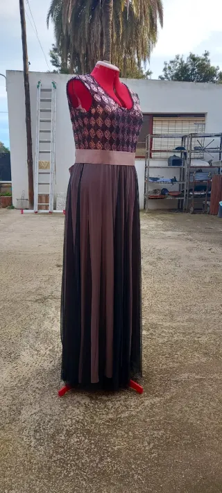 Vestido de fiesta(madrina) con cuerpo de lentejuelas en negro y rosa. Abertura en la espalda. Falda larga con forro rosa y tul negro. Cinturón en raso rosa