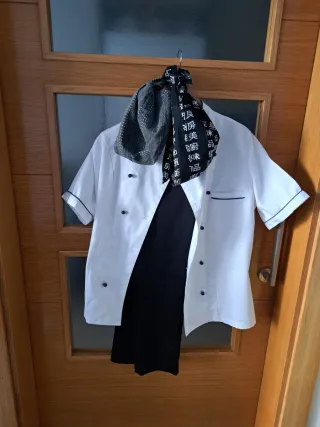 Conjunto de ropa para chef, ideal para mujer. - Chaqueta blanca de manga corta con doble botonadura. - Pantalón negro. - Bandanas (2) estampado con motivos orientales, algodón