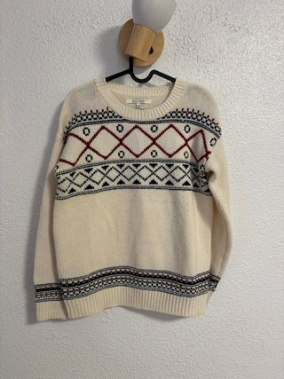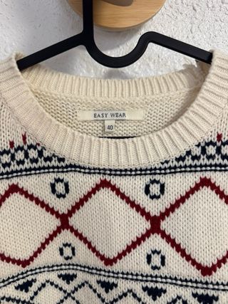 Jersey de punto con diseño nórdico en color blanco. - Cuello redondo. - Manga larga. - Estampado geométrico en contraste.