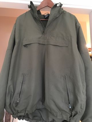 Cortavientos para caballero en color verde oliva. Diseño práctico y funcional. - Capucha ajustable con cordones. - Bolsillo frontal tipo canguro. - Cremallera parcial en el cuello. - Puños elásticos. - Cintura ajustable con cordón. -Forrado polar