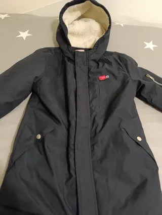 Abrigo de niño en talla 16, color azul marino. Ideal para mantener el calor. - Capucha forrada. - Cierre de cremallera. - Impermeable - Bolsillos laterales con botón. - Detalle de logo en el pecho. - Puño con cremallera en manga.