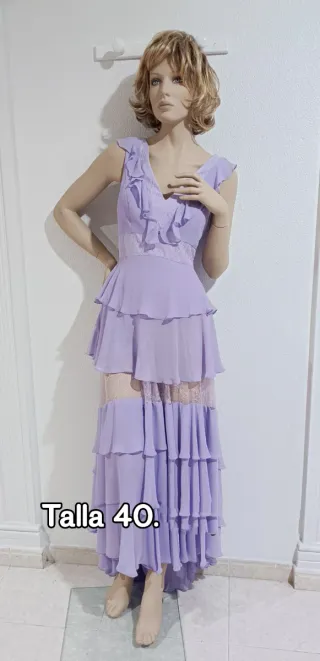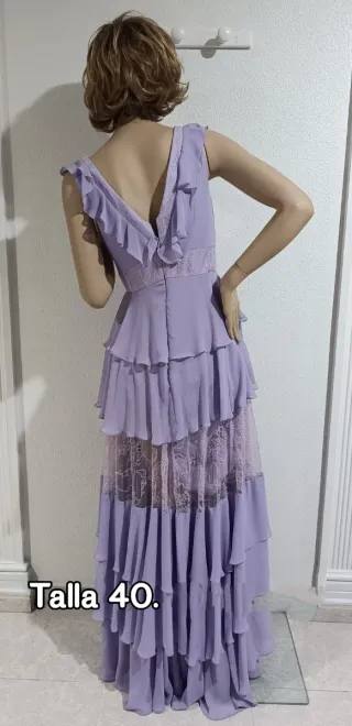 Vestido largo estilo boho en color lila. Presenta un diseño con volantes y detalles de encaje. - Diseño con volantes en cascada. - Detalle de encaje en la cintura y bajo. - Escote en V con adornos. - Falda larga con varias capas.