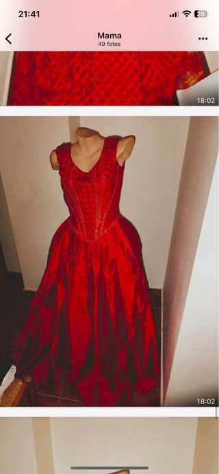 Elegante vestido de novia en color rojo, con un diseño que evoca la realeza. - Cuerpo del vestido adornado con pedrería. - Falda voluminosa con pliegues. - Diseño de escote en V.