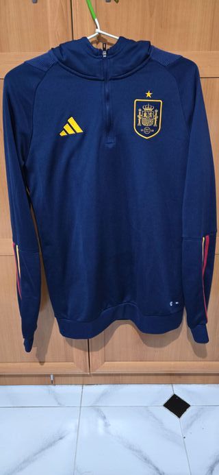 Sudadera con capucha de la Selección Española de Fútbol.Original y con poco uso TALLA S - Diseño con cremallera parcial. - Escudo de la selección en el pecho. - Logo de Adidas. - Detalles de las tres franjas en las mangas.