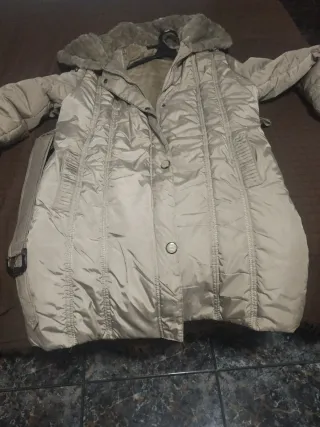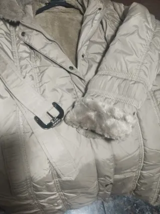 Abrigo elegante de señora en color beige. - Diseño acolchado con costuras verticales. - Cuello con acabado de pelo sintético. - Cinturón ajustable con hebilla. - Cierre de botones. - Bolsillos laterales.