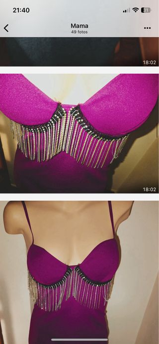 Elegante vestido de fiesta con un diseño único. - Tirantes finos. - Adornos bordados y pedrería. - Flecos en el bajo.