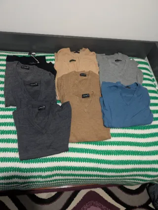 Conjunto de varias prendas de vestir para hombre. - 7 jerseys. - 1 pantalon. - 2 Camisas manga larga. -1 Camisa manga corta. Algunas prendas nunca se estrenaron.Otras usadas. Talla M,L,XL equivalen a una L. Perchas no incluidas. - Sudadera negra con detalles en verde y blanco. - Jersey de rayas verdes, blancas y grises. - Camiseta azul con texto. - Camisa de rayas finas azules. - Camisa de rayas negras y blancas. - Camisa negra de manga larga.