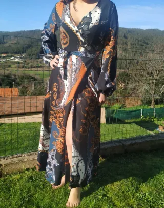 Vestido largo con un llamativo estampado. - Diseño cruzado con cinturón para ajustar y atar el vestido - Manga larga abullonada. - Abertura lateral pronunciada.