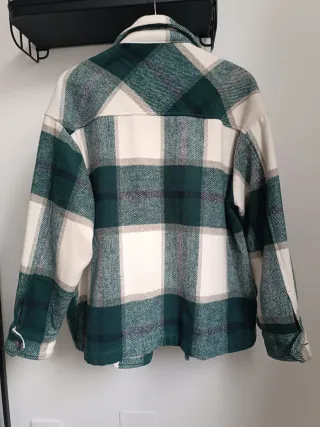 Chaqueta OVERSIZE de cuadros con un diseño moderno y versátil. - Cuadros en tonos verde, beige y gris. - Bolsillos frontales con solapa. - Cierre de botones. - Cuello camisero.
