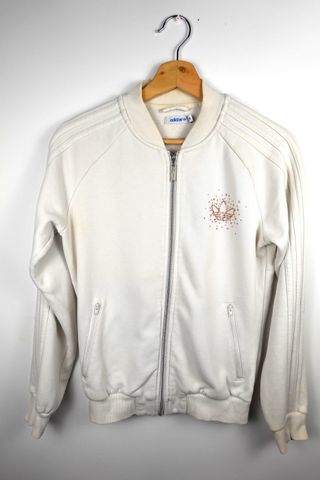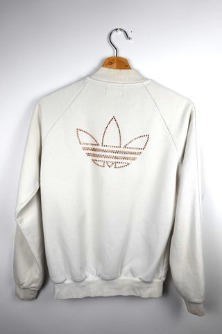 Chaqueta deportiva Adidas Originals en color beige, con un diseño llamativo. - Detalle de pedrería dorada en forma de logo. - Cuello redondo y puños elásticos.