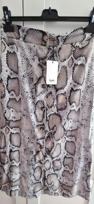 1. Falda cruzada con un bonito estampado con etiqueta y precio original de 24,95€. Marca Baobad. - Diseño con volantes. - Cierre con lazada. 2. Falda con motivos geométricos tonos amarillos-gris. Talla única. 3. Vestido sisa tacto aterciopelado tonos marrón y marrón anaranjado. 36-38 M. Marca Promod 4. Camiseta negra con manga. abullonada. Es ajustada, marca talla L de Stradivarius pero se ajusta al cuerpo. También se venden por separado. La falda con etiqueta a 3€, el resto de las prendas por 2€ cada una. Cuando acabe la temporada retiraré todo excepto la falda con etiqueta, de verano.