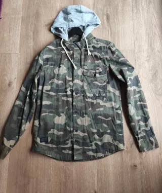 Camisa de manga larga con estampado de camuflaje y gorro integrado. - Cierre de botones. - Dos bolsillos en el pecho. - Cordones en el gorro.